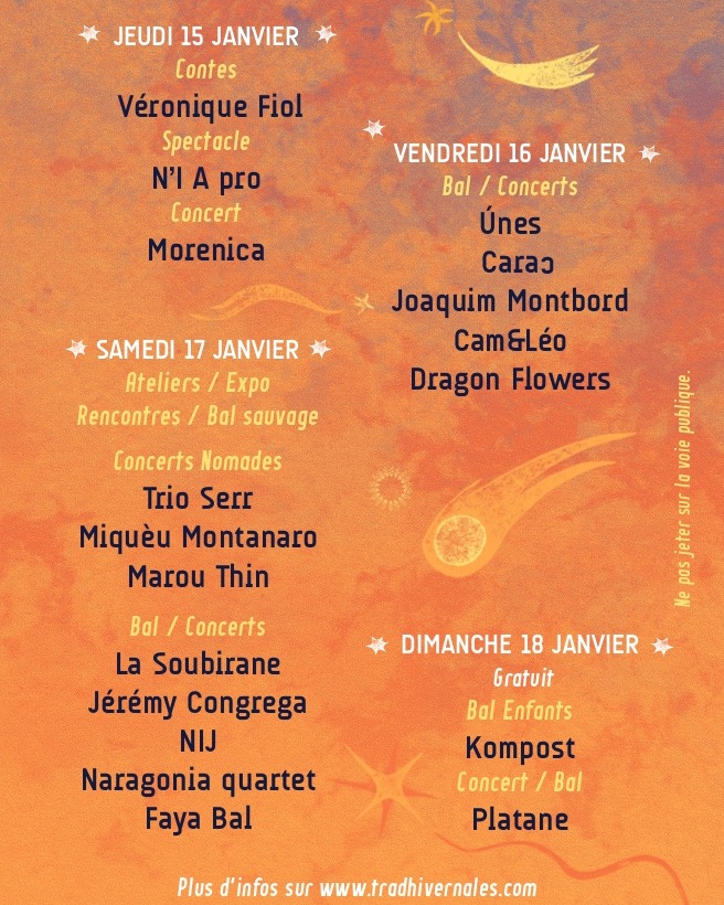 Organisées par l’association Coriandre, Les Trad’Hivernales sont plus qu’une série de concerts : c’est une véritable célébration de la culture d’Òc, de la danse, du partage et de la convivialité. Chaque édition attire un public fidèle venu de toute la région pour vibrer au rythme des bals, concerts et ateliers.